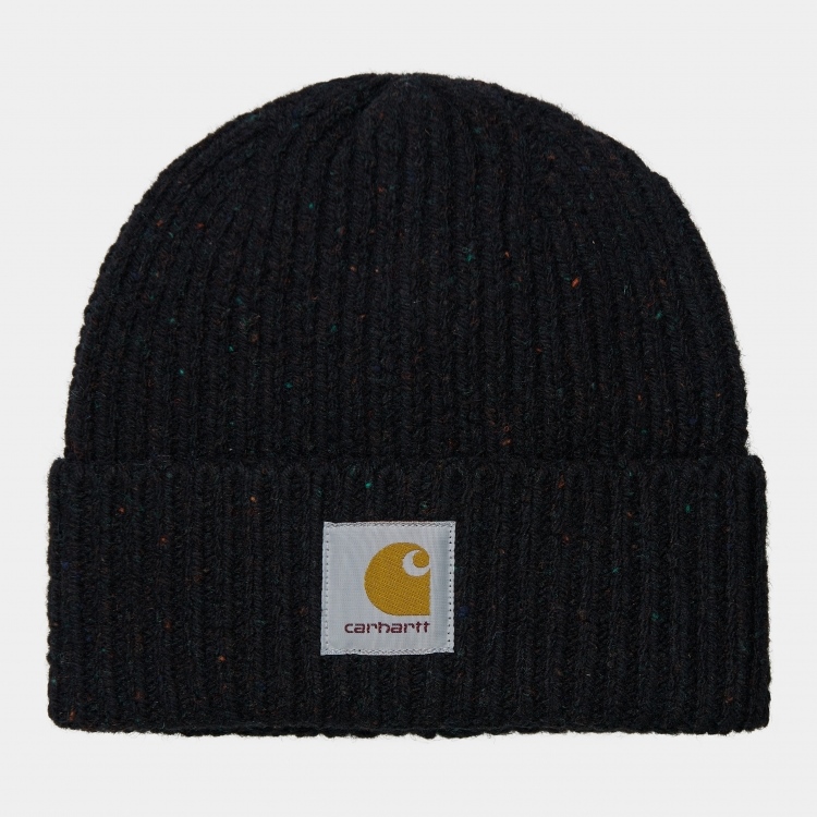 Die Carhartt WIP Anglistic Beanie aus einem stretchfähigen Rippstrick-Stoff hat einen Salz-und-Pfeffer-Look. Ein Kunsthornknopf auf der Rückseite sowie ein quadratisches Etikett runden das Design ab.
