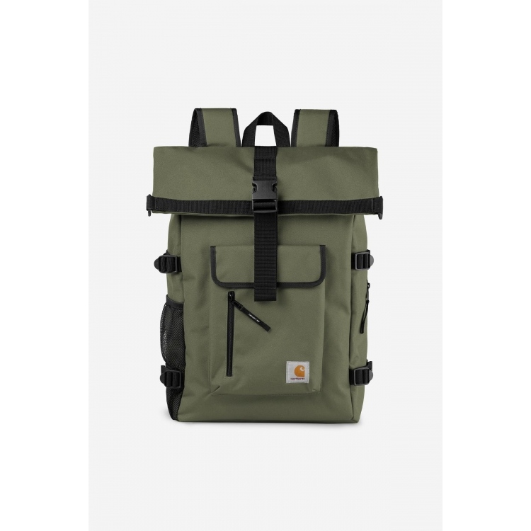 Der Philis Backpack aus 100% recyceltem Polyester von Carhartt kommt ungefüttert und ist wasserabweisend. Er bietet ein gepolstertes Laptopfach innen, ein Fassungsvermögen von 21,5 Liter sowie einen verstellbaren Schulterriemen. Das Square Label rundet den Look ab.