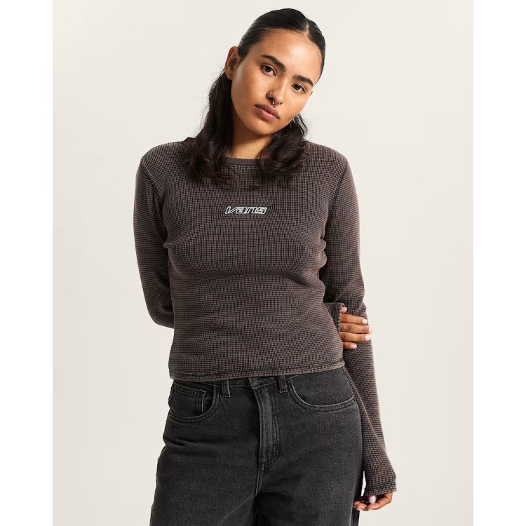Das Teri Waffle Langarmhemd von Vans besteht aus 100% Baumwolle und bietet lange Ärmel sowie eine verkürzte Länge für eine moderne, kurze Silhouette. Die Mineralwaschung sorgt für eine dezente Textur und rundet den Look ab.